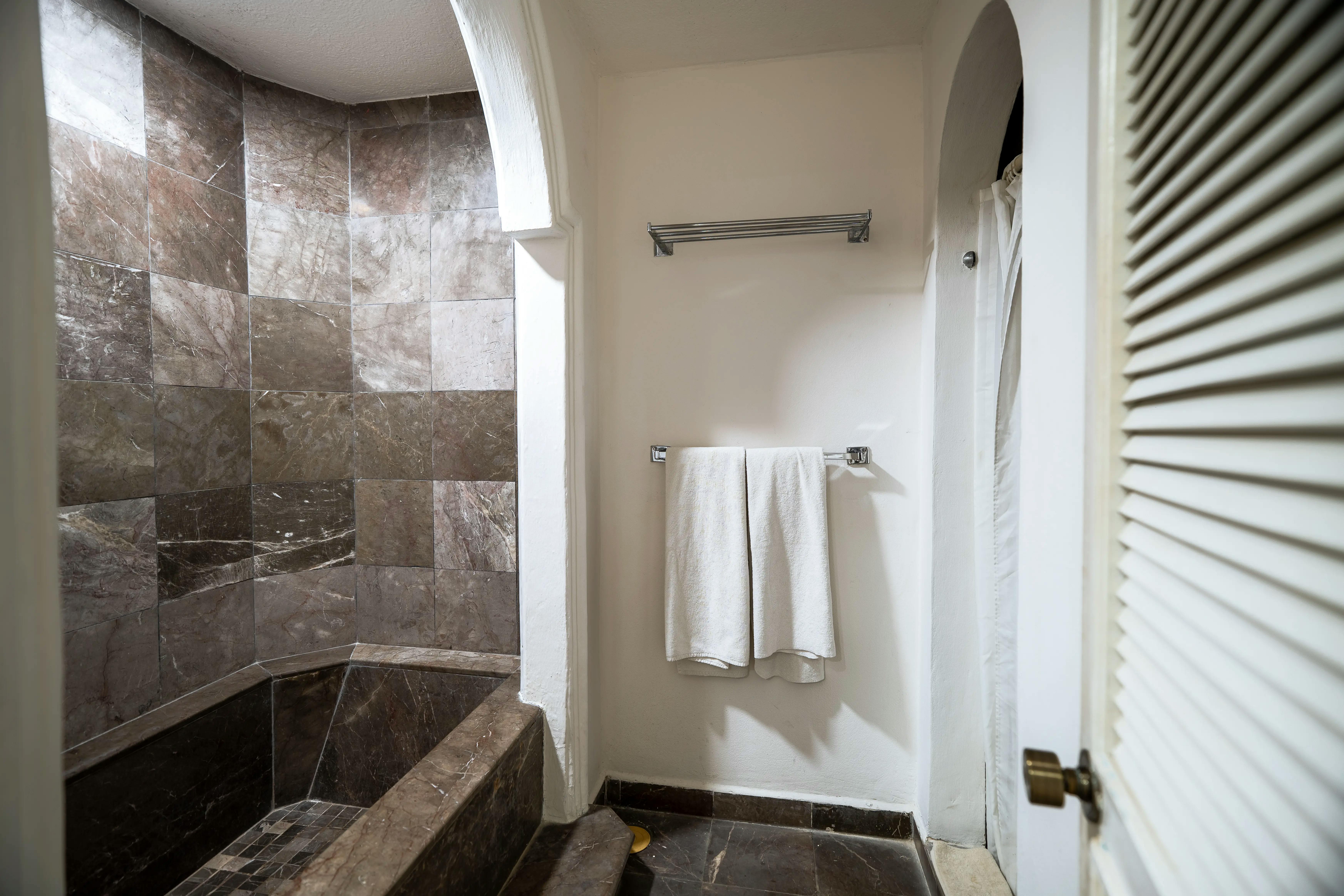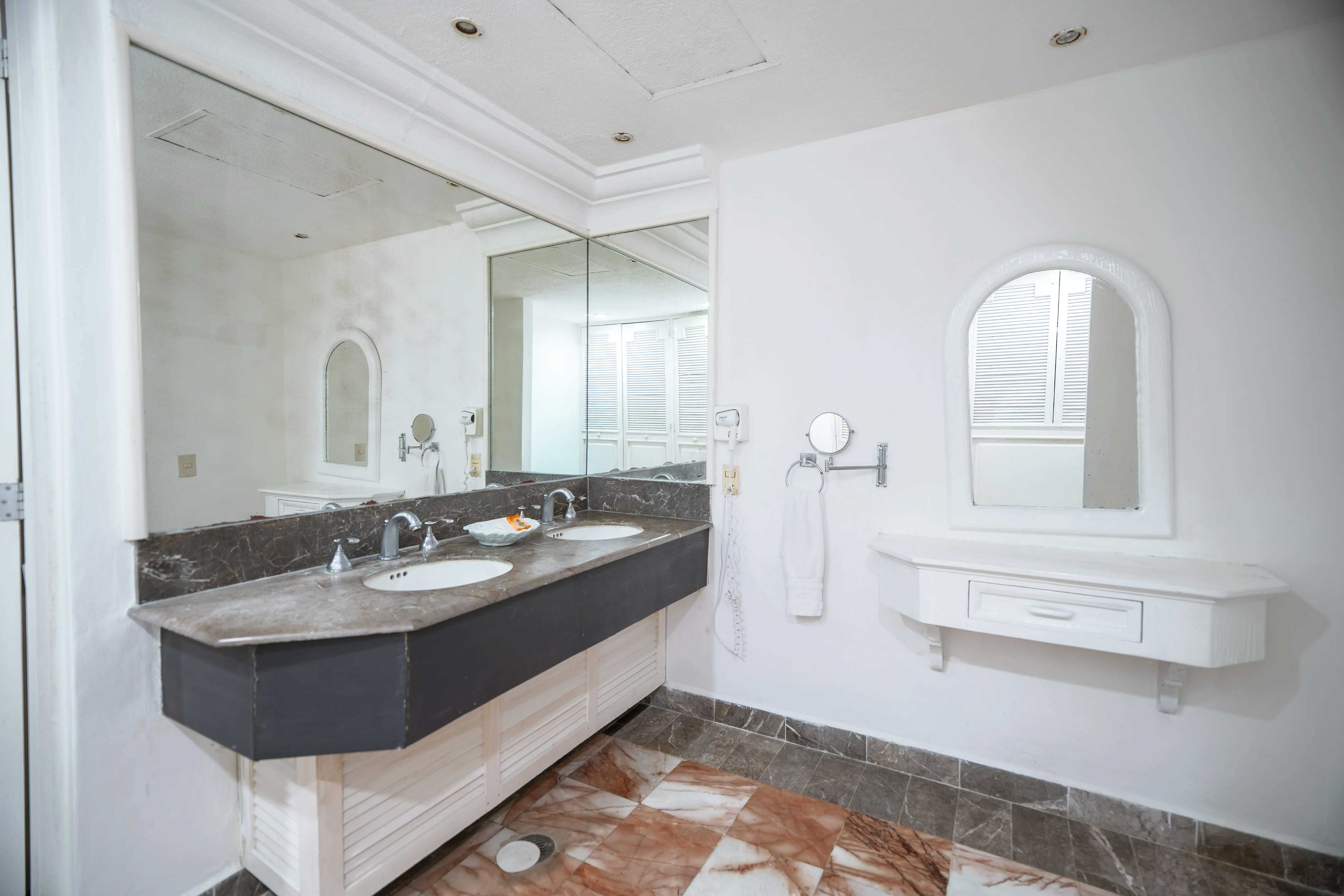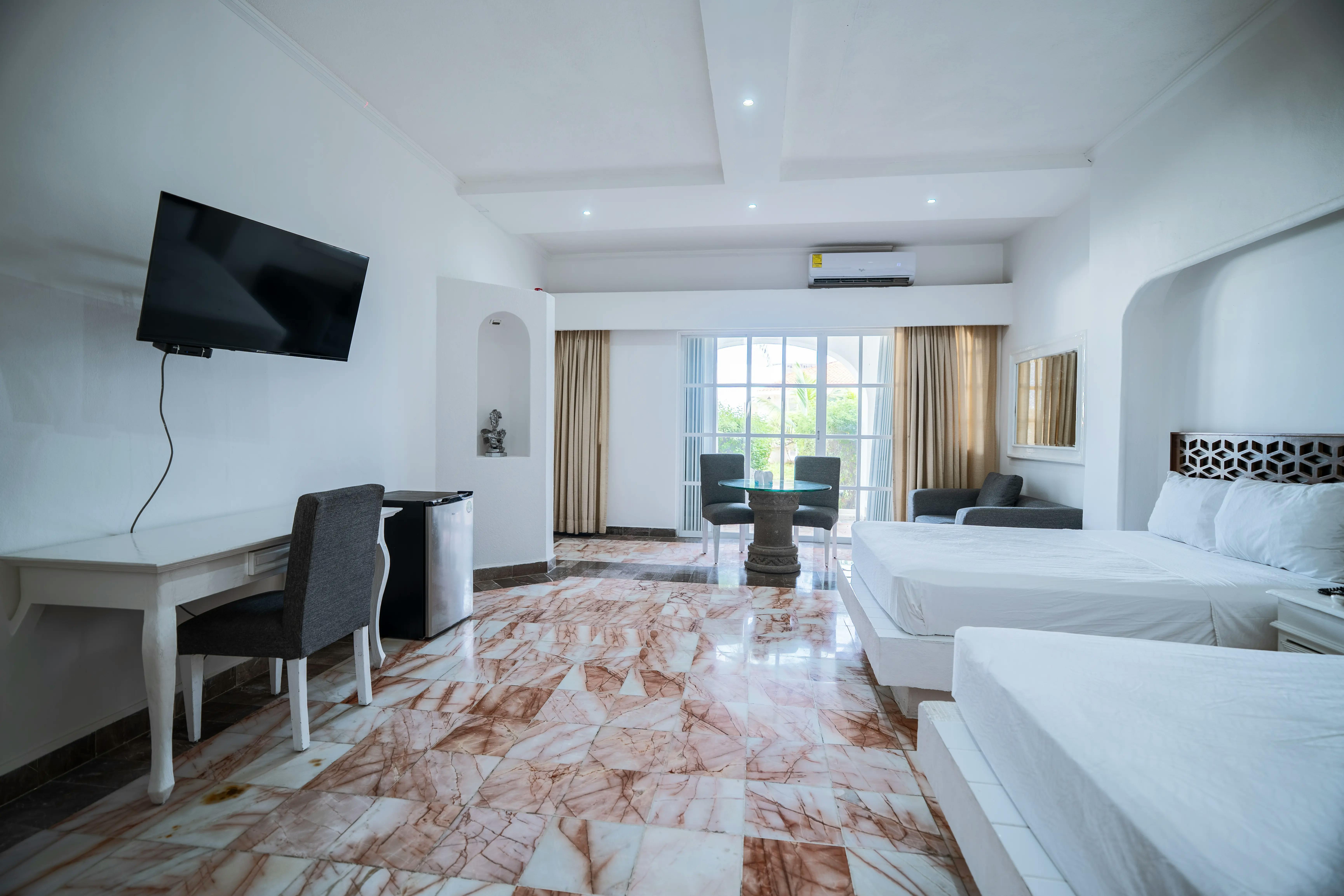 Large room with two queen beds and ocean views. Includes a private balcony, full bathroom, and premium bath amenities. Available on ground and upper floors, steps from the pool.